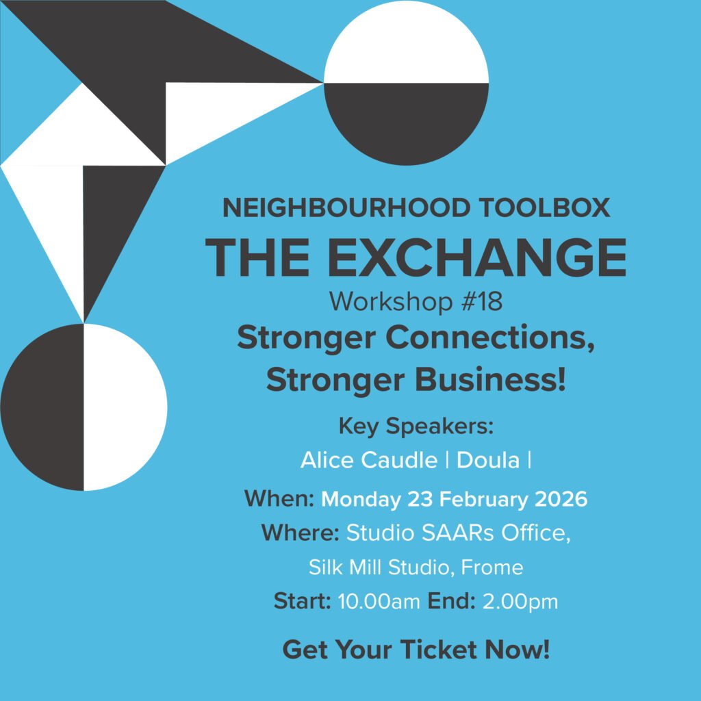 On Monday 23 January 2026 Neighbourhood Toolbox will host the Exchange #18 Stronger Connections, Stronger Business at Studio Saars offices in Silk Mill Studio in Frome. Click the image opposite to find out more and get your ticket.